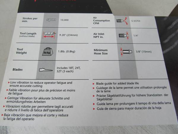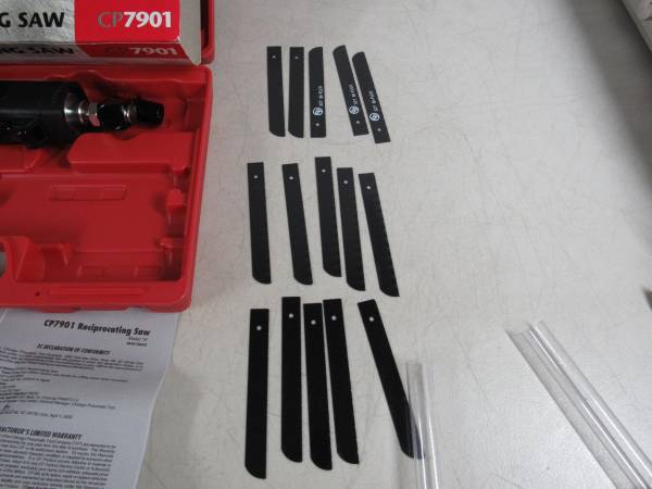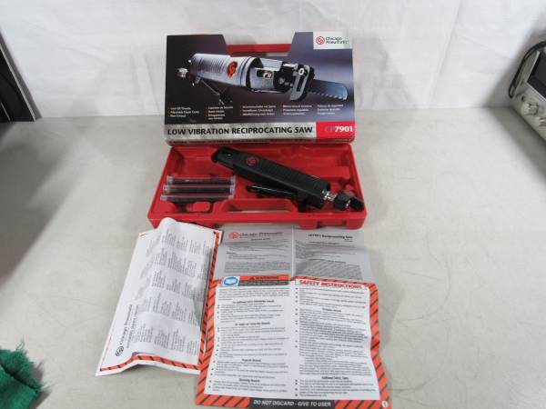 The Chicago Pneumatic is new and never used. Kit was opened for contents inspection, and to power test saw. Comes with 5 - 18T replacement blades, 24T replacement blades, 24T replacement blades, and...