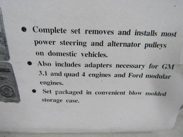 The pulley remover and installer set has never been used. 12 piece set with instructions and storage case. Minor storage wear to the outer case. No broken or missing parts. See photos
