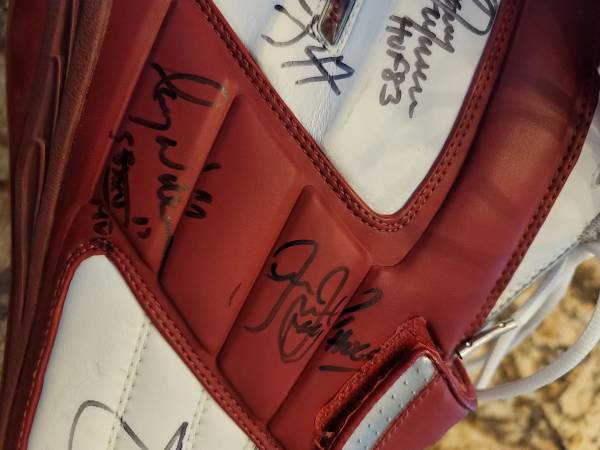 This shoe was signed at a Redskin alumni event in 2007. Sean Taylor#21, Sonny Jurgensen Hof 83,John Riggins SB xv11 MVP, Mark Moseley, Mark Rypien,Darrel Green # 28, Larry Brown#43, Art Monk, Cris Cooley# 47,Santana Moss #89, Gary Clark#84, Jason Campbell, and a couple other autographs I can't figure out. It is truly a one of a kind piece. The autographs alone are wort more than $2000.00 if they were signed individually.