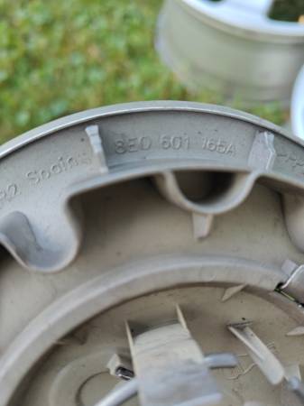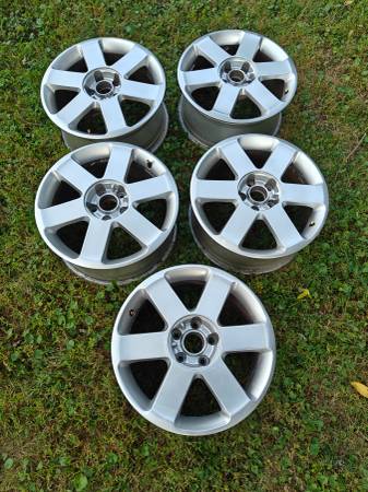 Five original Audi 17x7.5 aluminum alloy wheel rims (8E0601025J) with five matching hub caps (8E0601165A). One cap is brand new. Come from Audi A4 Avant but will fit all standard VW/Audi 5 bolts mount