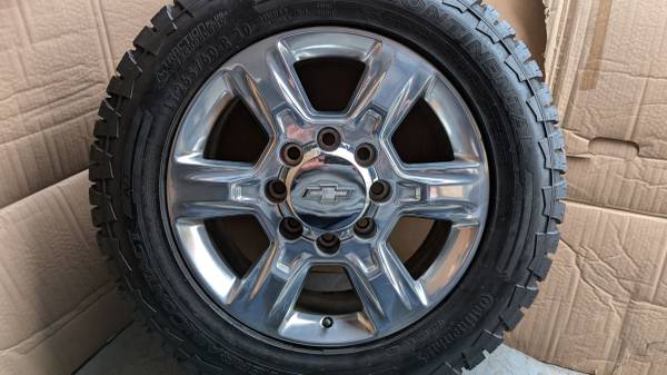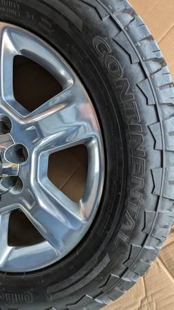 I'm selling my 2018 2500 Chevy Silverado Z71 20 inch Chrome Wheel & Tire combo with a LT265/60 R 20 Continental A/T Tire. The wheel is in like new condition, the tire has around 13 mm tread left.