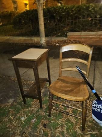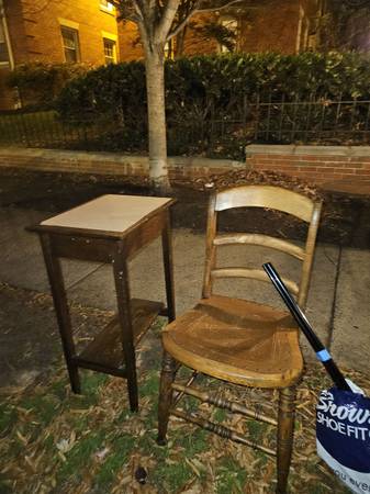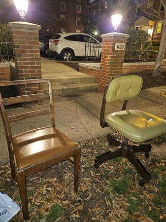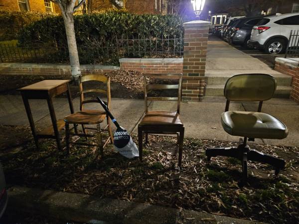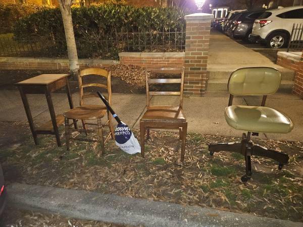 3 chairs and a shoe rack are on the curb. Good condition. Moving and don't have space. Leaving soon, so can't very if they're still there.