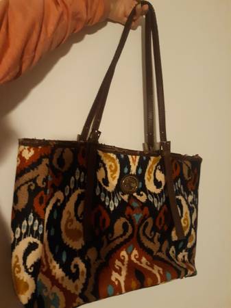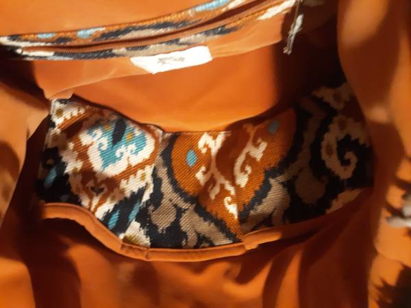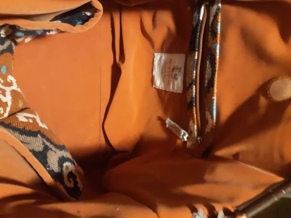 Eyecatching but worn. This bag caught my eye for its rich colors. Clearly well-loved. Leather straps and edging around top of bag flaking. Perfect for a textile creative who can remove and replace...