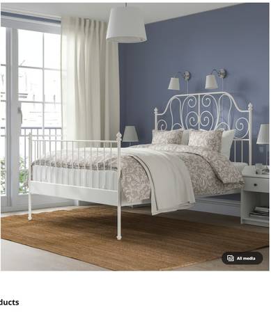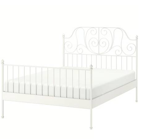 White metal full size bed frame - very good condition. Frame only. Easy to assemble. Stable and quiet construction. You can sit up comfortably in bed thanks to the high headboard. The high footboard keeps bedding tucked in. There’s plenty of space under the bed for storage boxes. You can easily vacuum under the bed frame to keep the space clean and dust-free.