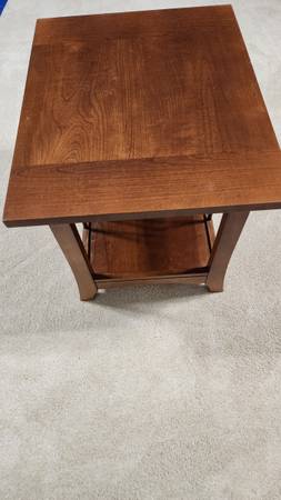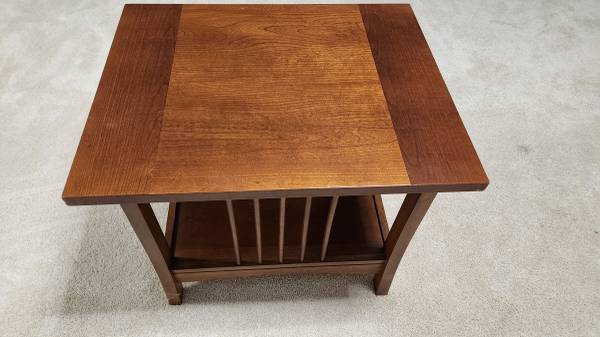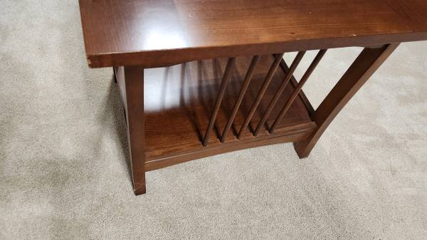 Wooden end table: 21" x 26" and 22" High. In excellent condition. We have used this as an end table and as a printer stand.