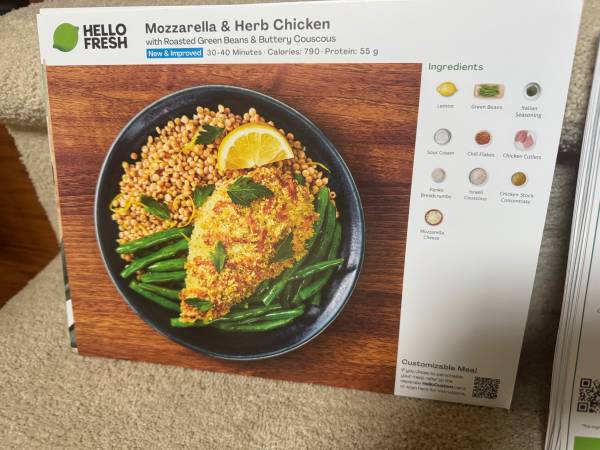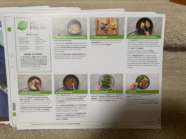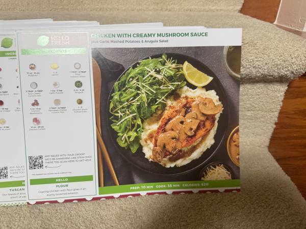 This posting is for several dozen meal recipe cards from Hello Fresh meal delivery service. Each card contains an ingredient list with complete preparation instructions and photos. The food isn’t included of course, but the cards are very helpful for new recipe ideas.