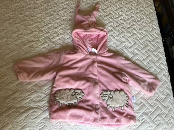 Free warm fuzzy winter fleece for your little one. Jacket-weight, zipper and velcro closure. Hoodie has bunny ears and white sheep pockets. Hood has a damaged seam (see picture) so it's free if you'd like it. The size has worn off but it was 18-24 months.