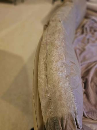Gold colored leather sectional sofa, Circular shape Has some wear, but still some life left. see pics for cracked leather mostly on back pillows. I cover bad spots with blankets and throws. Perfect...