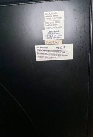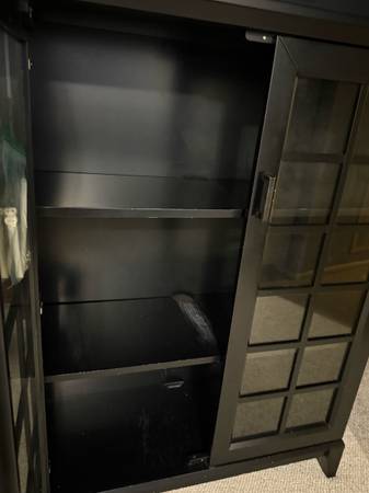2012 Crate & Barrel 2-door cabinet. Black laminate, 2 adjustable shelves, glass doors. Expected wear and tear given age. Includes anti-tip hardware to anchor to wall. It’s heavy and you’ll...