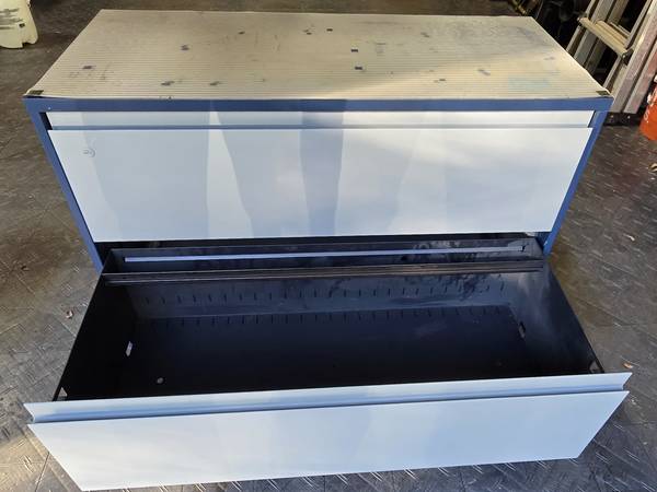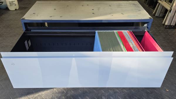 Hanging file storage, in good condition. Hanging files pictured included. Do not have key to lock. Includes hanging files. PICKUP ONLY.