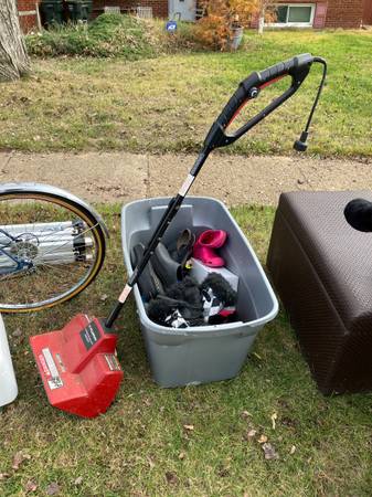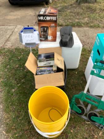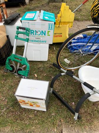 Cleaning out some stuff. Eclectic mix of items including but not limited to: DVDs, shoes, golf clubs, coolers, bicycle (needs tires and a little TLC but it’s been store inside), tools, large fold-out canopy, and other items. I’m still putting stuff out.